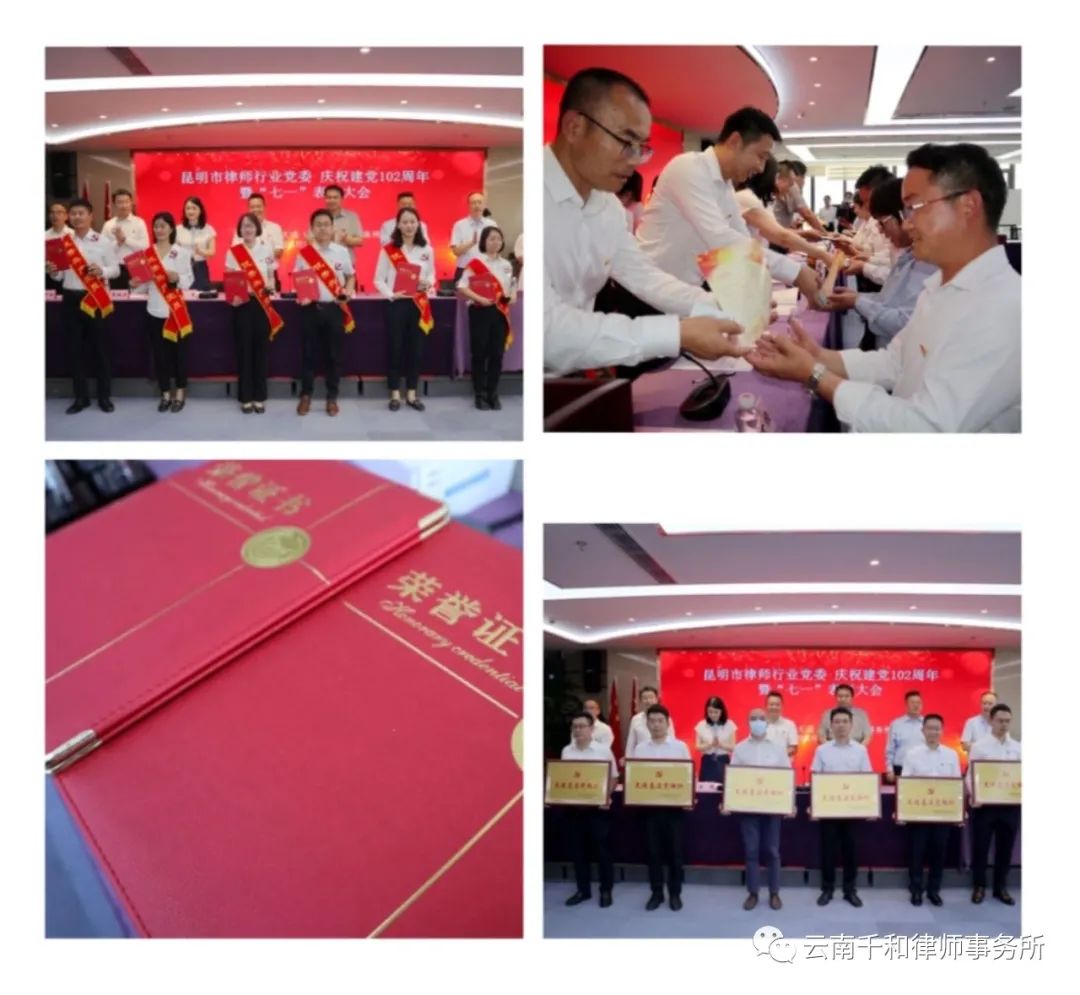 中共云南千和律师事务所支部刘姝律师荣获“优秀党务工作者”荣誉称号,黄玲律师荣获“优秀共产党员”荣誉称号。